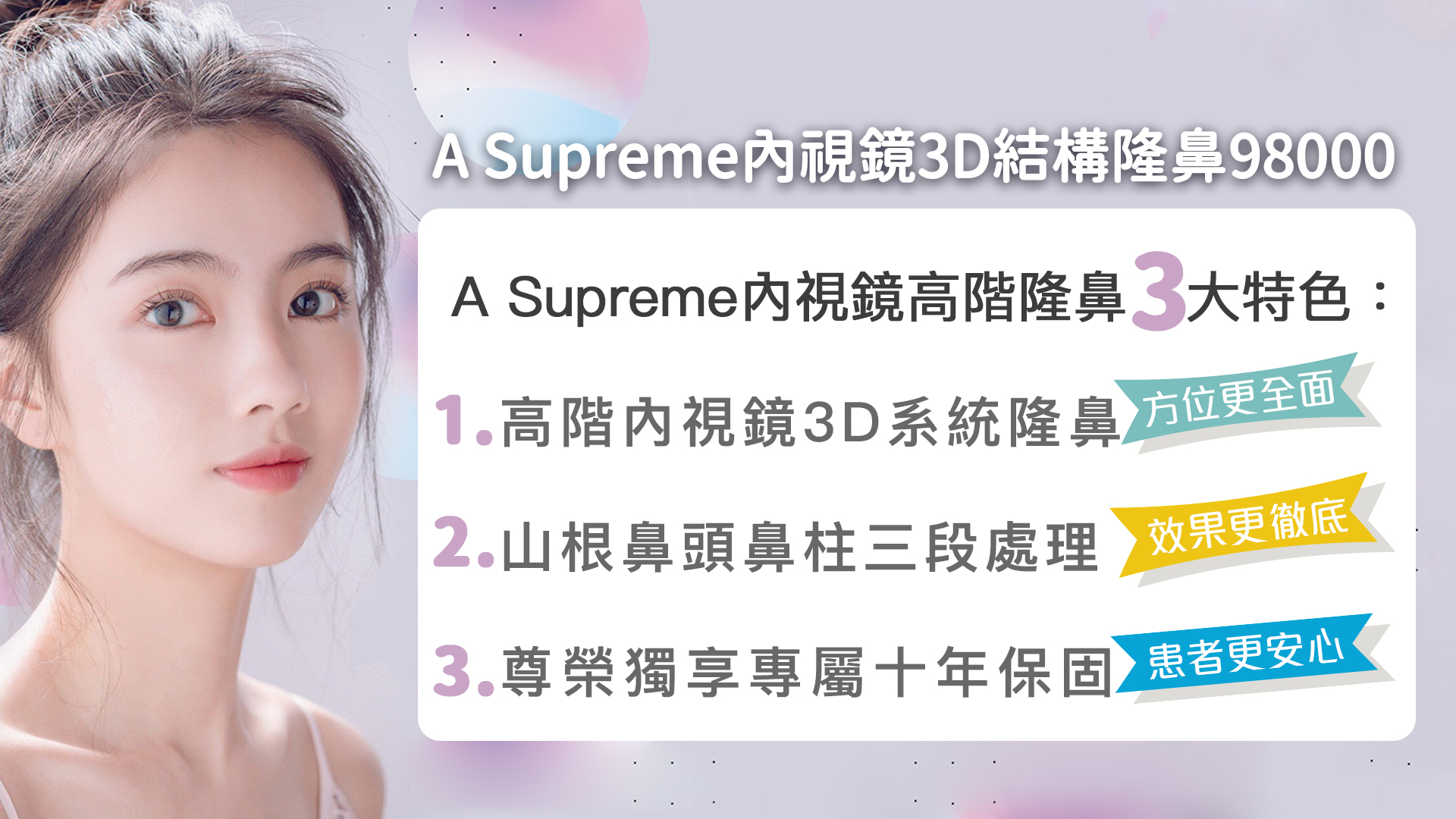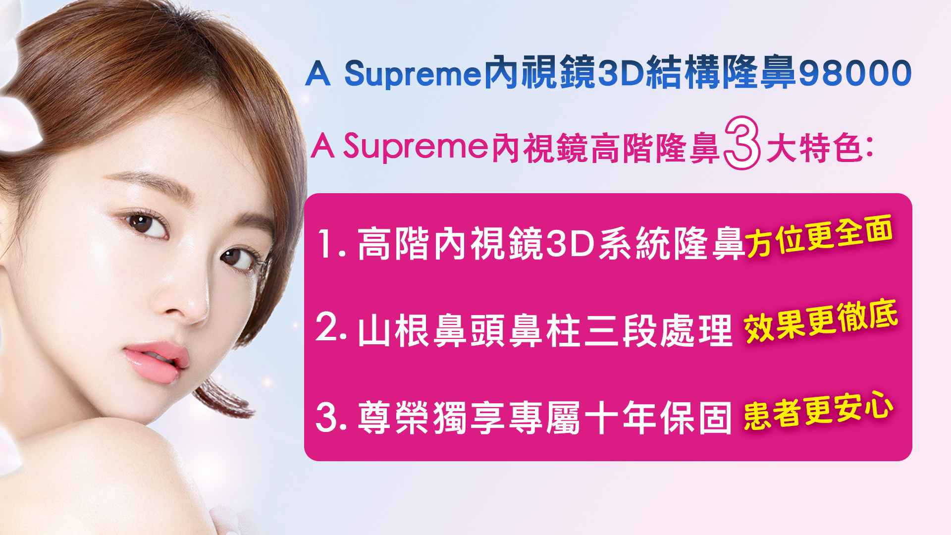 您好,A Supreme內視鏡3D隆鼻手術活動期間台幣128000。手術採骨膜下微創技術,山根鼻頭鼻柱三段處理,術後微腫,我的患者通常可以正常作息,7-10天就恢復不錯了。我們在台北市大安區金山南路二段3號9樓(信義路金山南路口),捷運東門站3號出口。 預約專線(02)2396-9298,歡迎您蒞臨評估,謝謝您。 https://venusclinic.com.tw/showcase.php?id=181 維納斯Line客服:https://lin.ee/av5w1JW 2025/02/05